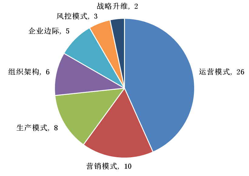 本文所研究的60个案例中,运营模式的数字化转型案例最为丰富,战略升维的案例最为稀缺(图1)。因为运营模式的转型主要在企业内部进行,以企业运作全流程的数字化刻画为基础,建立数据中台等分析平台,优化企业的运作流程和资源调度。对大多数企业而言,从运营模式开始数字化转型的成本小,见效快,对企业自身要求低。战略升维则涉及到外部影响,对企业自身的资质和体量有更高的要求,大多数中小型企业并没有这种能力;而一旦抓住了战略升维的机会,企业将会取得长期的正外部性和收益。