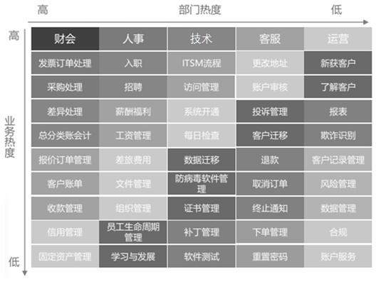RPA应用场景在不同行业、不同企业、不同部门会有热度的差异(图1)。金融行业作为率先引入RPA的行业,其应用渗透率最高,其中普及率前三的细分领域分别是银行、证券、保险,主要应用在数据打通、风险排查、合规管控等业务场景中,而财务部门作为率先引入RPA的部门,其使用面最广,主要应用在订单处理、账务核对、资产管理等业务场景中。其他行业的RPA应用普及仍处于起步阶段,如在制造业的数字化进程中,RPA成为工业互联网和物联网的数据抓手,最终的方向是实现订单、物流、仓储、供应整个链条端到端自动化。