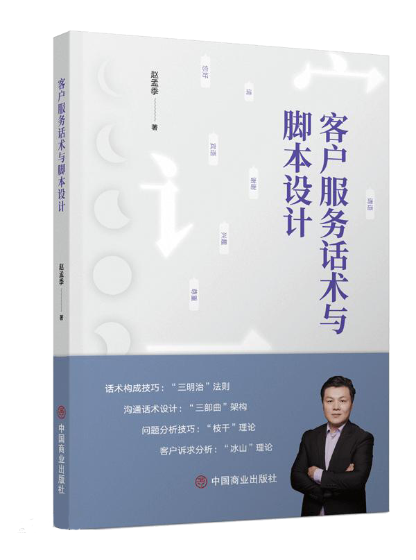 图书简介:书可以说是伴随我们一生的“朋友”,在众多的“朋友”中,有一种“朋友”是可以直接帮助你成长的,我们把它叫做工具书。今天给大家推荐的就是一本客服工作者的工具书,特别是对于那些已经在客服岗位每天忙碌的小伙伴,看一看这本书,一定会给你带来新的收获与思考。这本书就是由《客户世界》杂志编委、专栏作家,客户服务行业知名员工技能训练师赵孟季先生在2020年出版的《客户服务话术与脚本设计》。