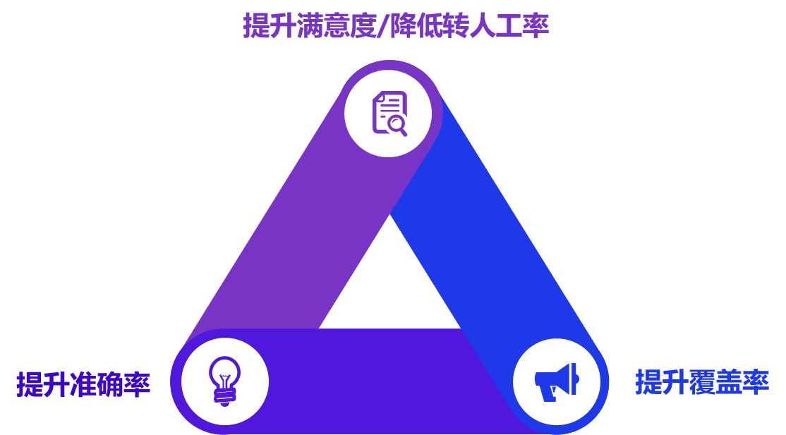因此,我们的训练工作就需要尽可能提升机器人的业务覆盖率、准确率、满意度/降低转人工率为主的三个目标,如图1所示。唯有围绕目标开展机器人的训练与优化方才能真正使得机器人在减轻人工服务压力的同时,又不会降低客户满意度,更不会引起客户投诉,造成客户流失。