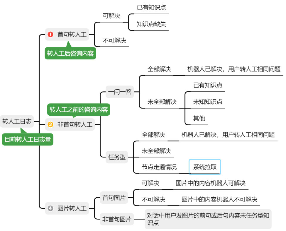 机器人训练运营最重要的是用户对话日志质检,通过分析用户对话日志能更加贴近真实客户,知道客户真实意图与需求。对于日志的分析,要建立合理的数据跟踪指标,围绕目标设计完整的一套分析质检方案,同样以转人工指标为例可建立出一套如图2所示的转人工日志质检分析方案。