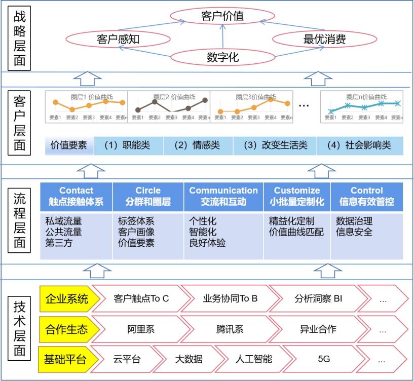 在数字化客户关系管理框架中对价值要素的使用有些不同,我们需要根据划分的圈层和分群来考虑挑选价值要素从而形成不同圈层和分群客户的价值曲线。从而有效地打造良好的客户体验和客户忠诚度。