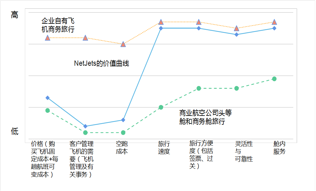 那么NetJets的战略布局的右方,它几乎都可以达到和专机类似的水平。在战略布局图的左侧和头等舱的水平差不多,这样就获得了性价比最大的一个产品的价值曲线。