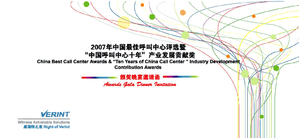 2007年“中国最佳呼叫中心金耳唛大奖”暨“中国呼叫中心十年”产业发展贡献奖颁奖晚宴定于9月18日晚在北京举行。本年度中国最佳呼叫中心评选由中国惟一的国家级呼叫中心行业协会CNCCA主办,代表中国惟一接轨亚太地区最佳呼叫中心评选,是信息产业部惟一认定的行业奖项。本届颁奖晚宴由VERIENT Systems公司冠名赞助。