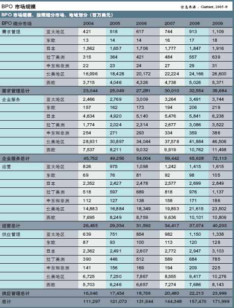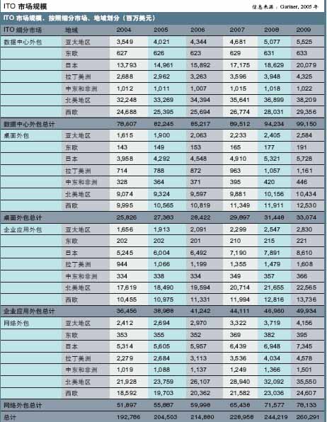 以下是Gartner对全球服务外包市场分析及预测 (2005年):
