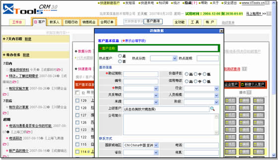 XToolsCRM的快速新建客户颇有些新意,从操作上看,它突破了关系型数据库中客户和联系人表分离的制约,同时保存两表数据,很方便。