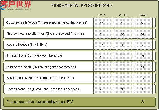 一次问题解决率的记分已经作为定义和测量标准拥有了更高的协调性,但是人工座席利用率,生产力的代名词,应该受到更多的关注,因为它是合理规划和管理资源的一个重要体现。员工离职率测评的是平均年流失率,是检测人力资源管理效率的一项重要指标。除了像处理今年24%的流失率所付出的高成本和努力外,客户服务的间接成本也是值得注意的。员工旷工对企业来说是无法计算的损失。注重激情,提高满意度和激发员工的主动性是解决这项问题的关键点。电话放弃率统计显示有十分之一的来电者会放弃再次来电,因此呼叫中心要满足客户的期望还有很长的路要走。接听速度的记分统计中10秒的接听记录有所下降,但是20秒的接听标准有整体的提高。生产小时成本是计算提供特定服务实际成本的标准尺度,同时也是了解呼叫中心每个生产小时所需的投资成本的重要依据。