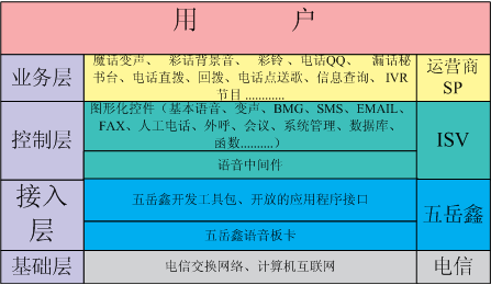 依靠五岳鑫公司强大的技术优势和对增值业务的深刻理解,以我公司自主研发的具有国际先进水平的语音板卡为基础,为广大增值业务服务商提供的语音增值业务综合平台,将种类繁多的语音增值业务融合在一个系统平台中。不仅支持行业内大多数的语音增值业务,还能方便、快速地面向市场提供各种的语音增值业务。