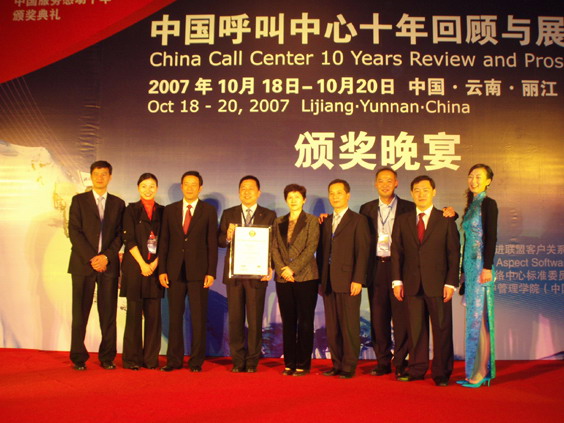 当晚,盛大的“中国呼叫中心十年成就颁奖晚会”在大港旺宝国际饭店隆重举行。北京移动、上海电信、海尔集团、联想集团、DHL、PCCW、建设银行、招商银行95555电子银行中心、平安保险、中国人寿等荣获了“呼叫中心十佳企业”奖,北京移动潘惠、上海电信周正浩、海尔集团李边芳、联想集团史红新、