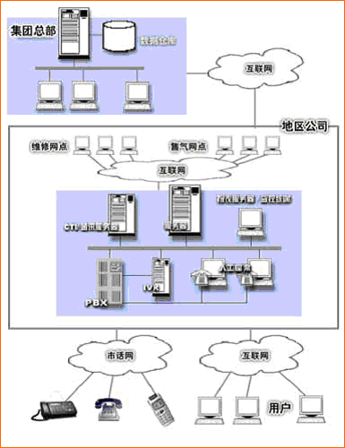 各地区系统通过互联网和下属维修网点、销售网点相连,构成一个地区性服务网络。各地区系统通过互联网和集团总部连接,构成信息收集网络。前者支持业务服务,后者支持管理决策,共同构成综合公用事业服务平台。