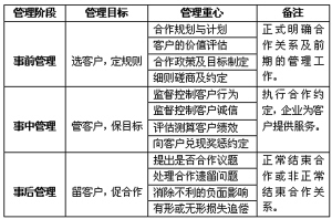 下面从事前(合作开始前)、事中(合作中)、事后(后续合作)三个阶段方向性地来谈一谈如何行使客户关系管理职能化(见表1)。