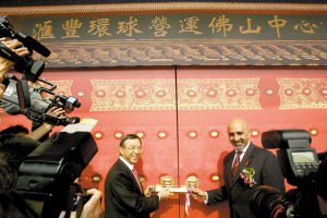 汇丰银行亚太区主席郑海泉(左)与汇丰全球运营首席执行官康儒明(右)先生用富有中国特色的开门仪式,寓意汇丰银行全球营运佛山中心正式开业。