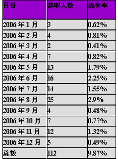 1、2006年1月-2007年3月员工流失率如下