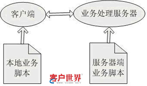 整个业务数据和业务处理都由XML配置管理,系统业务被分成本地业务逻辑和服务器端业务逻辑,客户端通过提取本地业务逻辑脚本中的数据处理业务逻辑,业务处理服务器通过提取服务器端业务逻辑脚本中的数据访问数据库,并将数据库返回结果发往客户端。本地业务逻辑和服务器端业务逻辑之间的逻辑关系是通过一套配置脚本维护。如图: