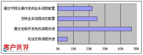 另外一方面,考虑电话中心信息系统对业务流程优化的支持程度,最主要的方式是通过定制开发完成业务流程改进,通过可视化操作完成业务流程配置的比例相对较小。