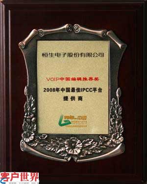 08年4月,北京,作为中国著名的IT行业应用软件及服务提供商、IPCC核心平台及顶级呼叫中心整体行业解决方案提供商,恒生电子被VoipChina网评为“2008年中国最佳IPCC平台提供商”,这是HSIPCC再一次获得殊荣,及来自业界的认可与肯定。