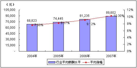 第一,行业薪酬水平持续上涨且增长幅度加快。随着以IT咨询、IT教育与培训、系统集成为代表的高端IT服务市场的快速发展以及CPI指数的增长,IT服务行业的整体薪酬水平继续保持增长,2007年平均薪酬水平达到89602元,涨薪幅度达到10.30%,居各行业涨幅榜的前列。