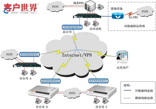 利用公共宽带网络,实现总公司和各个分公司之间IP电话互通功能,从而免除总公司和各个分公司内部沟通的通讯市话和长话费用。