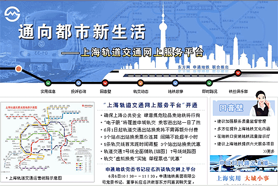 东方网6月6日消息:为了让上海市民能更及时、更全面地了解上海地铁的建设进程和运营情况,促进上海地铁事业更快发展、更好地为上海市民服务,由东方网上海频道和上海地铁联合推出的“通向都市新生活——上海轨道交通网上服务平台”6月6日正式开通。该平台不仅一网打尽地铁生活的实用信息,更提供市民投诉与建议的直通车,成为方便市民出行的“金牌小秘书”。