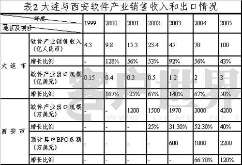 西安软件园是国家计委和信息产业部认定的国家软件产业基地和国家软件出口基地,是西部最大、全国四强的软件产业基地和软件出口基地,其基本条件与哈尔滨极其相似。1998年由科技部认定的国家火炬计划软件产业基地建设完成。西安软件园在册的从事软件开发、系统集成、网络工程和工业控制的企业560家。软件从业人员4.2万人。2家企业上市,销售收入过亿元的企业9家,过5000万元的企业12家,过1000万的企业55家,人员100人以上企业79家。5家企业通过CMM2以上评估。美国、日本、法国的著名软件企业如IBM、IPS、富士通等都已在西安软件园建立了研发机构。目前,入驻的日本独资企业15家,开展对日外包业务的企业25家,从业人员两千余人。西安市软件与信息服务业销售收入和出口参见表2。