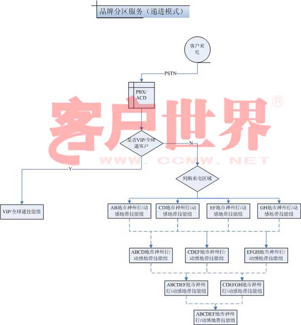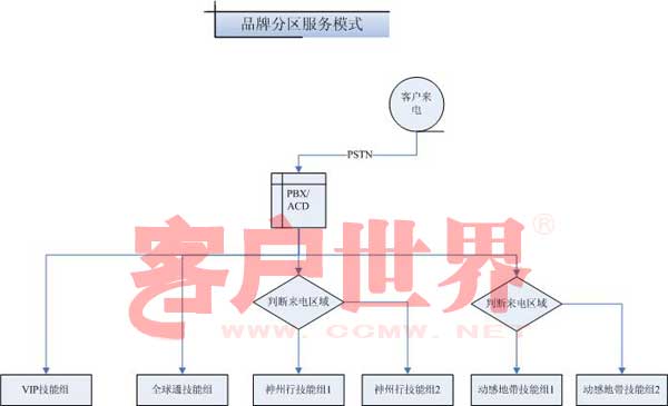 即10086按照所服务客户的品牌分为VIP技能组、全球通技能组、动感地带技能组和神州行技能组,每个技能组的座席代表负责接听本省所有地区该品牌的用户来电,技能组与技能组之间不能进行话务溢出(见图一)。