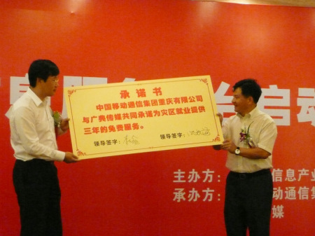 6月30日下午,重庆信息产业局主办、中国移动通信集团重庆有限公司和广典传媒协办的“重庆市移动劳务信息服务平台启动仪式”在重庆世纪金源大饭店顺利举行。