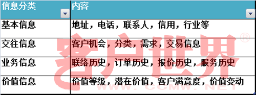 CRM系统帮助我们实现了所有和客户有关的信息的整合,比如我们和客户所有的交往情况、客户的反馈、客户和我们的交易情况、客户的特点、客户对我们的历史价值、客户参加过我们哪些活动、客户的需求聚焦在什么地方等等,这些信息是我们了解客户的最好途径,同时CRM有一套信息归集的方法,帮助我们把纷繁复杂和杂乱无章的客户信息进行分类,而不同的员工或者部门一般只能掌握客户的一部分信息,比如销售人员掌握的是客户的一些交往信息,市场人员则可能非常清楚哪些客户参加过哪些活动,客户对哪些方面比较关注?服务人员则了解客户对我们哪些地方不满意?有哪些投诉?那么几乎没有人能了解一个客户的全部信息。但是很多业务的处理需要大量的、不同类型的信息支持,才能做出正确的处理。CRM系统可以帮助我们建立一套信息归集的方法,同时进行有效的传递。那么CRM系统的信息都是围绕客户合作伙伴的信息,我们一般对客户信息科技进行如下的分类(见表一)