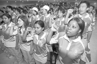 北京奥运会观众呼叫中心12308热线于7月1日正式开通,从7月1日至9月25日,呼叫中心将每天15个小时为国内外观众提供全方位信息服务。图为在奥运会观众呼叫中心志愿者誓师大会上,留学生志愿者在大会上宣誓。