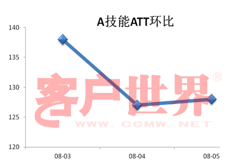 3月份开始采用新上岗员工和队列溢出等策略接听处理A技能话务,随着业务熟悉度的提高,ATT从138秒下降到127秒,环比有8%的下降幅度,说明加强培训操作,可以有效降低ATT。