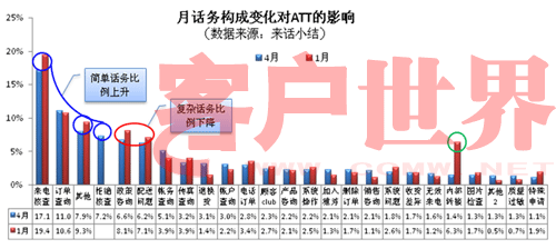为了分析“话务构成”和“业务周期”影响ATT的关联性,我们还是取08年1月和4月的来话小结分布比例占前5位的数据,进行参考分析:(下图4)