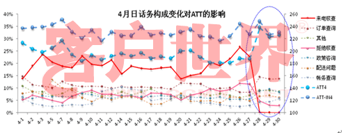 从上图可见,月头的上月遗留问题(配送不及时、到货差异破损、帐务问题等)、月末现场冲刺KPI等客户流程因素对ATT有明显影响。需要特别说明的是,4月27日后ATT有一个明显的扬起,这是客户业务政策调整的直接反应,在下一节中详细分析。