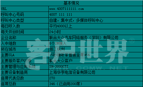 2007年秋天,联合大众汽车网络服务(深圳)有限公司现代化、智能化的大型全国电话呼叫中心落成并投入使用。从投入使用至今,呼叫中心经历了从无到有、不完善到健全的发展历程,联合大众24小时全国服务热线现已成为客户价值与公司价值之间传递的桥梁。