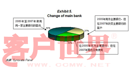 图4显示了,2005年至2007年追踪小组所使用的银行。从表面可以看到,除了工商银行,其他一些主要银行的使用非常稳定。虽然消费者越来越不满,但似乎他们还是“忠诚的”。