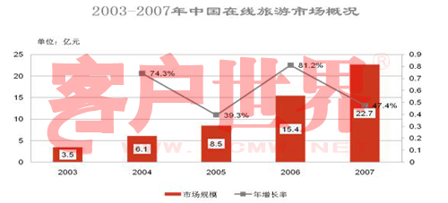 根据Iresearch的数据,2007年,中国在线旅游市场规模达到22.7亿元,比06年同比增长47.5%;其中携程以56.3%的市场份额继续领跑,比06年的54.2%增长了2个百分点。与此相对比的是,美国三强旅游网站之一的Travelocity,在06年第一季度的全球营收就达到了24亿美金。具体情况如下图所示: