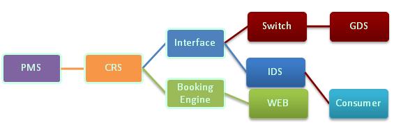 笔者画张图供大家参考,PMS是指酒店的前台管理系统,CRS就是本文谈论的核心,他往往会通过interface(接口)和booking engine(预定引擎)两种方式外接出去,通过接口进入switch(pegasus类)或者IDS(知名的ctrip之类)或者直接连接上GDS(全球分销系统)然后到达真正的客户端;通过booking engine 一般是走网络等途径到达消费者,这是最简单的线路图,但已经基本可以说明问题,中软和石基(chinaonline)基本上是靠近PMS端的,也就是在CRS之前,hubs1、德比基本上是switch这一功能,罗盘更像是一个企业网站供应商。写到这里,上述的几家企业估计心里也会不服气,但你们可以回忆一下,你们去和酒店谈你们的系统的时候是不是在说我是某国际大PMS供应商的中国代理,我很熟悉……我们对接了很多国内外的GDS/ADS/IDS,接口的问题都已经解决……我们为您提供网上的预订系统,给您带来更多的电子商务渠道的客人……是这样的吗?是这样就说明您真的不是在做CRS了。