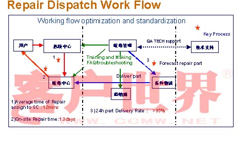 刚才讲了电话销售,每天把用户的需求及时地传递到我们经销商的店面,由经销商完成整个产品的销售,下面跟大家去分享在维修当中是怎么去做了,可以看到一开始的时候,爱普生整个的维修,整个的路程比较长,用户有维修需求的话,会打电话到呼叫中心,呼叫中心会打到维修管理的公司,由维修管理公司再传递到我们当地授权的服务中心,由服务中心再给用户提供上门的服务,整个过程比较长。但有了一站式服务以后,用户直接保修到热线服务中心,由热线服务中心直接派单到维修中心,由维修中心直接去给用户提供上门的服务,以前我们整个的派单大概需要4个小时的时间,而现在整个派单只有12分钟就可以完成了,同时也大量缩短了维修周期,因为以前的维修周期可能两天左右,但现在我们的维修周期大概在1到3天左右,整个一站式的服务,通过把客户的信息最大化利用,改善我们服务的品质,它是有一个很大的帮助。