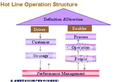 我不知道在座的各位有没有见到过这个呼叫中心运营的结构?也是选自CCCS客户联络中心的标准体系,这个是推荐给大家,我希望大家能够正确地、全面地理解,那作为一个呼叫中心的管理者,你的工作在什么,你的重点在什么?大家看到,我是把它叫做呼叫中心管理的金字塔,它由七个部分来组成。最基础的部分呼叫中心的定义和方向,任何一个企业建立它的呼叫中心,没有钱,想随便找一个东西去建设,它都有一个使命。作为一个呼叫中心来说的话,毕竟它最主要的驱动力是什么?最主要来自于我们的客户,呼叫中心为什么存在?是因为我们有客户存在,所以我们的呼叫中心才会存在。那么公司为什么要投资给你?是因为我们有公司的策略,公司的战略需要我们呼叫中心去完成。作为一个呼叫中心你怎么样去实现用户对我们的期望,怎么样去达成企业对你的期望。这个是我们的实现因素,如果你的呼叫中心多大多小,实际上所有的运营,就是包括三个部分,第一个部分就是我们的过程管理;第二个部分就是我们的现场运营管理;第三个部分就是我们的人员管理。实际上无论你的驱动因素,还是我们的实现因素中间的差距,就是我们要做的绩效管理,所以通过这七个因素的金字塔图的话,使大家对呼叫中心的管理有一个全面的理解。今天我跟大家分享管理的实践最主要就是在过程管理、现场管理还有人员管理这三个部分。