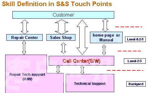 但是作为呼叫中心来说的话,毕竟人力的成本,还是人力的要求一定不同于这些其它部门的技能要求,大家可以看到,对于服务中心、店面,还有我们的手册,它技术的定位实际上定位到Level0.5—1,也就是我们的呼叫中心在它的窗口里面,整个呼叫中心的定位是高于服务中心、店面和手册的。对于呼叫中心来说是作为后台,也就是说如果用户出现了问题以后,希望用户去阅读我们的手册,去寻找我们的服务中心,去寻找我们的店面,再有问题的话,也可以直接通过我们的呼叫中心进行了解。通过这个图的话,实际上使你感觉到你的呼叫中心在很多的窗口里面,它的定位是不同的。举个例子来说,移动集团都有一个10086的呼叫中心,实际上还有很多的店面,它的营业厅,那对于呼叫中心来说,公司有没有定位,营业厅的营业人员,技术的定位在什么地方?与10086的技术定位到底有没有区别?实际上弄清楚以后,如果解决不了问题的话,怎么升级的一个过程。刚才这个图是在整个公司的集团里面去定义呼叫中心的一个定义。
