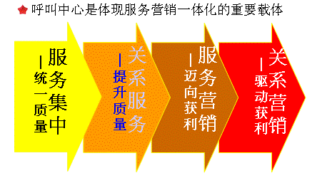 呼叫中心是体现服务营销一体化的重要载体。我在前面已经说了,服务和营销一个是被动一个是主动,一个inbound一个outbound,呼叫中心可以非常完整地将两者融合到一起,它是一个非常重要的服务营销的载体。我们从呼叫中心整个营销策略的进程当中,可以看到非常明显的四个阶段: