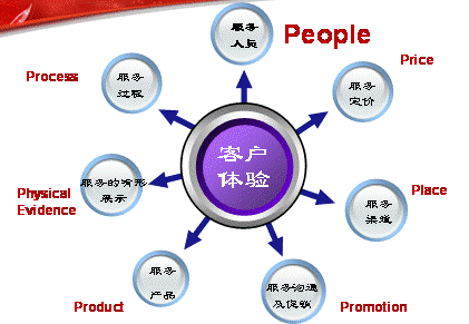 下面这张图是服务营销的7P模型,在这里我认为最应该关注的是People——人。这里,我想引用世界经理人刊登的一篇文章“影响中国的十大管理理念”上的一段文字:“迈向服务型经济实际上就是迈向人才经济。在制造业中,价值是由机器创造的。在服务业中,价值则是人创造的。”这也是在服务业中,要将“人”进行体现。也许你不在乎为你制造产品的工人长的美或丑,但为客户服务的人员如果长的很丑,对服务就会有一定的影响。大家只看产品结果,不关注过程,但是服务却是与过程紧密的结合。