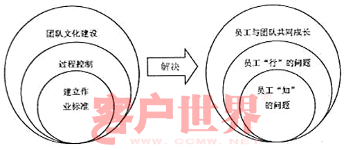 首先,简述一下对营业厅管理工作的认识。营业厅管理工作可以理解为“以建立作业标准为基础,以过程控制为手段,以建立团队文化为目标”的管理结构。其简易模型如下图所示: