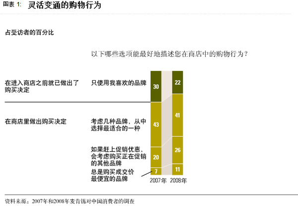 根据我们的最新调查,中国消费者愿意为他们经常购买的某种品牌产品支付平均2.5%的溢价。与此相比,在发达市场,消费者愿意为熟悉的品牌支付的溢价可以达到20%或更高。我们的研究表明,不断上升的通货膨胀率正在使中国消费者的价格敏感度提高,而对他们喜欢的品牌的忠诚度则在降低。在今年的调查中,有37%的受访者表示,他们是基于店内促销优惠和最低成交价来做出自己的最终购买决定的;与此相比,在2007年的调查中,如此表示的受访者只有27%(图1)。
