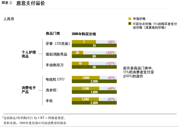 尽管中国消费者愿意支付的溢价相对较小——所有消费者细分群体的平均值为2.5%,但在中国的高收入(每月收入超过5,000元人民币,约合730美元)群体中,潜在的溢价空间要大得多。该细分群体目前在私人消费额中所占的比例为15%,但到2015年,这一比例预计将提高到50%以上。我们的最新调查显示,这些高收入群体愿意为许多门类的产品支付超过60%的溢价(图2)。