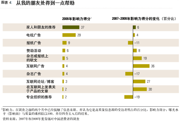 在中国,推荐的重要性比在我们所研究的任何其他市场中都要大得多。以购买一台笔记本电脑为例,在参与今年调查的中国受访者中,有55%的人都表示,他们在购买前一定会请朋友或亲戚为其推荐一款品牌;与此相比,在美国这一比例仅为37%,而在世界其他国家的比例甚至更低。市场营销人员必须找到各种不同的方式,使自己的品牌能在广大消费者中口口相传,互联网的崛起则为此提供了一个具有创造性的机会。