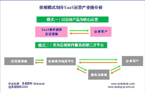 第一, 以自身产品为核心进行运营,以金算盘和铭万为代表的围绕电子商务提供关键性应用和Salesforce.com、800APP为代表以在线CRM为核心应用切入到SaaS市场。