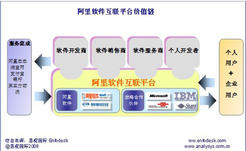 阿里软件是阿里巴巴集团于2007年1月成立的子公司,在阿里巴巴的整体战略布局中,为进一步B2B用户提供交易管理需求而成立,它的最重要的创新意义就在于突显B2B向更高层级跃迁的趋势,实现“天下没有难管的生意”的使命。阿里软件互联平台是一个开放的平台,这个平台容许接入不同类型,不同行业的应用软件、商业工具和服务,将汇总数千家的ISV提供产品和服务,并支持对多个单一产品进行业务整合或应用关联,从而构成一个完整的客户价值链。