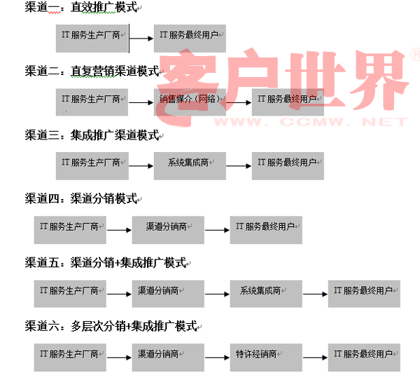 对IT服务的销售渠道,实际上比较复杂,很多IT厂商选择的都是混合渠道。对于销售渠道,可以是“人”,也可以是“组织”,也可以是“媒体”或“媒介”,读者对渠道有一个正确的理解与把握实为必要。总体来说,IT服务有以下六种渠道模式,见图一: