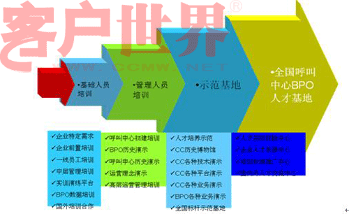 自然,首先得有人才的生产活着吸引能力,也就是意味着产业园区周边有大量的相关院校,或者产业园区具有非常强的吸引外地人才的能力(例如北京),然后才谈到人才的培养,扬州技师学院首设“呼叫专业”成为行业内一个亮点,事实上,北京早在2年前已经在开展试点的工作了。关于人才解决方案以及人员的培训,下面的这张图表述更加淋漓尽致: