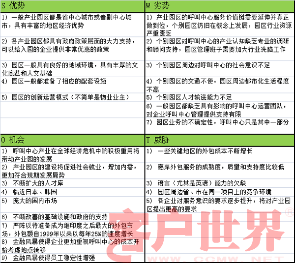 笔者在此更愿意用SWOT分析的模式来阐述中国呼叫中心产业园区的特点: