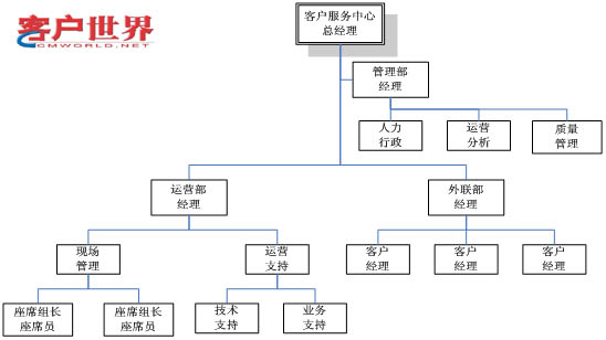 在综合型客户服务中心中,内部各个部门的沟通、协调与对各个相对独立部门的监管是非常重要的,因此,主管监管部的副总经理是非常重要的职位,他的设定应该高于主管运营部的副总经理。同时,为了保证工作的效率,负责运营分析的经理是可以跨过各级管理人员直接与中心最高管理人员联系、提交报告的(图中用红线标示的)。
